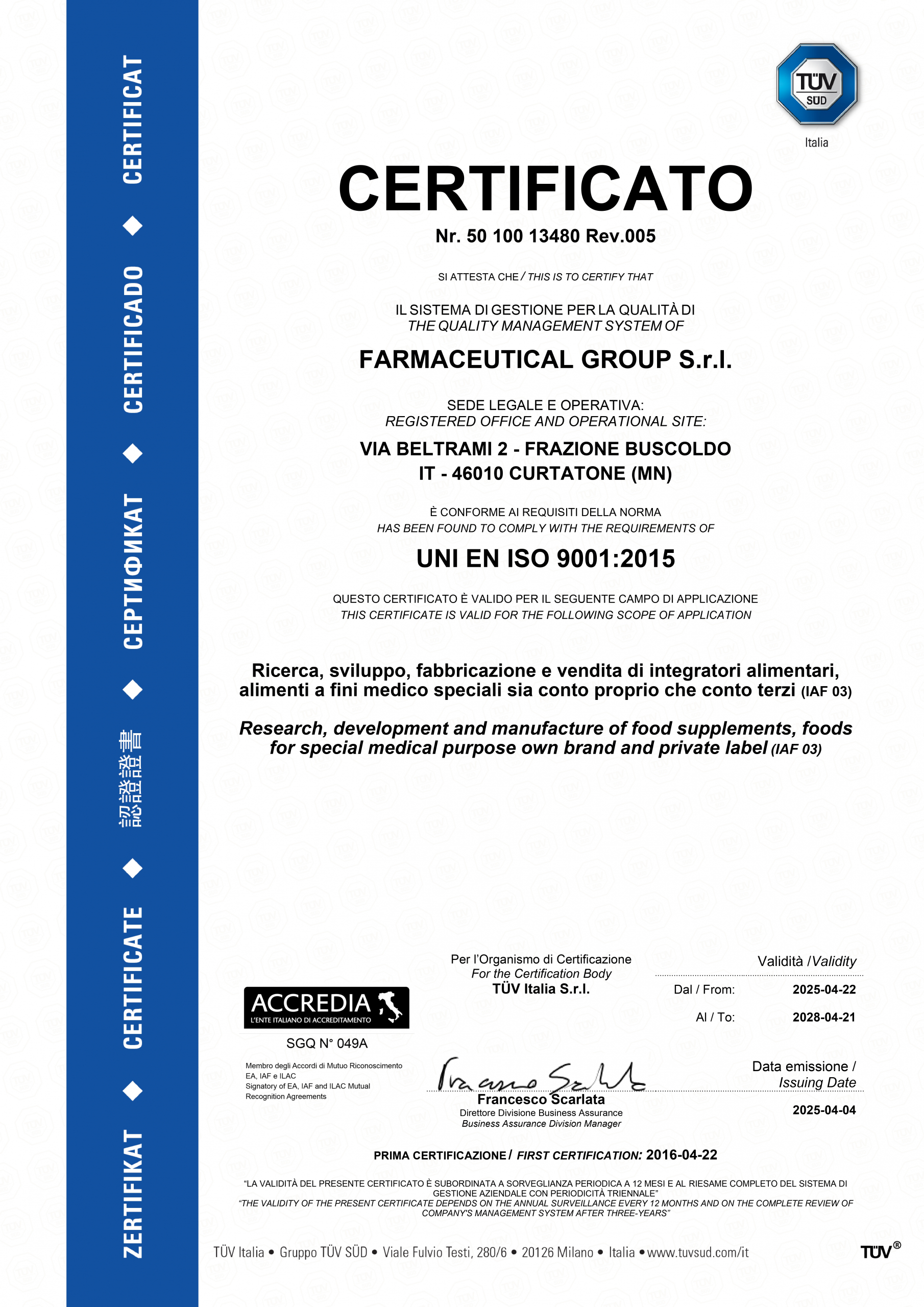 Farmaceutical Group s.r.l. possiede un sistema di gestione della Qualità certificato TÜV Italia e applica un sistema di gestione della qualità per la sicurezza dei prodotti alimentari relativo al seguente campo di applicazione Produzione e vendita di integratori alimentari e alimenti per gruppi speciali in forma solida e liquida per conto proprio e per conto terzi certificato TÜV NORD CERT GmbH.